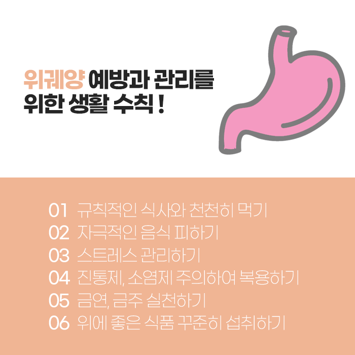 셋째, 약물 복용에 있어서도 주의가 필요합니다. 진통제나 소염제를 장기간 복용해야 하는 경우에는 반드시 위 보호제와 함께 복용하거나, 의사와 상담하여 위장에 부담이 적은 대체약으로 조절하는 것이 필요합니다. 또한 흡연과 음주는 반드시 줄이거나 중단해야 하며, 위장 건강에 해로운 습관은 가능한 한 제거해야 위궤양 재발을 줄일 수 있습니다.