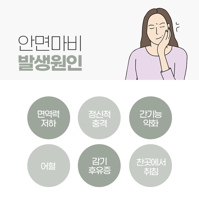 구안와사의 가장 흔한 원인은 면역력이 떨어졌을 때 발생합니다. 특히 감기나 독감 등의 바이러스성 질환 이후, 강한 스트레스나 수면 부족, 간 기능 저하, 어혈, 찬 기운 등에 노출될 때 발병할 수 있습니다. 또한 당뇨병, 고혈압과 같은 만성 질환이 있을 경우에도 안면신경 기능이 저하되면서 구안와사가 발생할 가능성이 높습니다.
