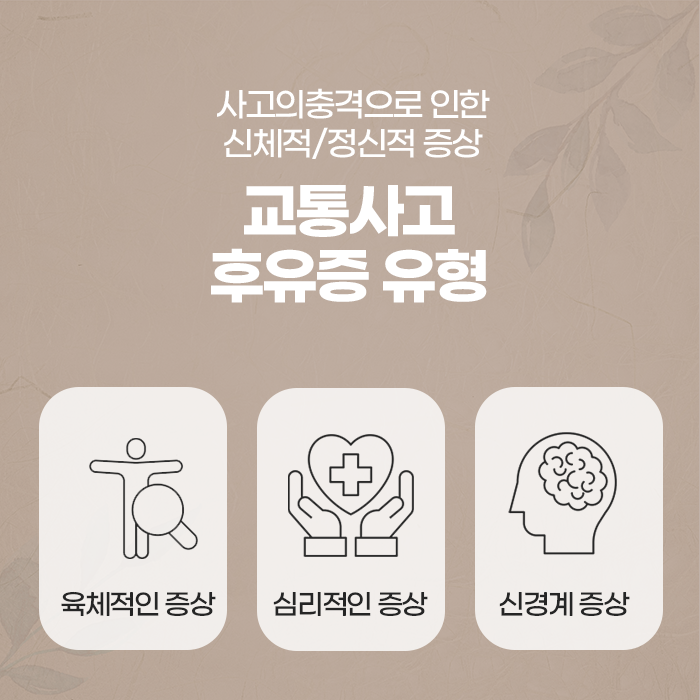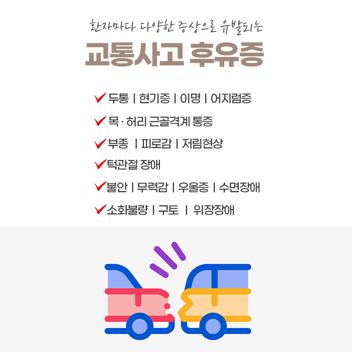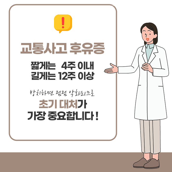 사고 후 증상이 가벼워 보인다고 하더라도 방심하지 말고, 초기부터 빠르게 치료를 시작하는 것이 중요합니다. 치료와 병행하여 균형 잡힌 식사, 충분한 휴식, 스트레스 관리, 올바른 자세 유지 등의 생활 습관 개선도 회복을 돕는 중요한 요소입니다. 종합적인 관리가 이루어질 때 신체는 점차 건강을 되찾고 사고 이전의 활기찬 일상으로 돌아갈 수 있습니다.