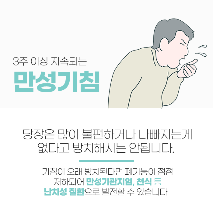 만성기침은 단순히 불편한 증상일 뿐만 아니라, 때때로 심각한 질환의 신호일 수 있기 때문에, 8주 이상 지속되거나 증상이 심해지면 반드시 의료 기관을 찾아 정확한 원인을 확인하고 적절한 치료를 받아야 합니다. 만성기침은 일상생활에 큰 불편을 주는 증상입니다. 특히 기침이 8주 이상 지속되면 다른 질환의 징후일 수 있으므로 원인 파악이 필요합니다.