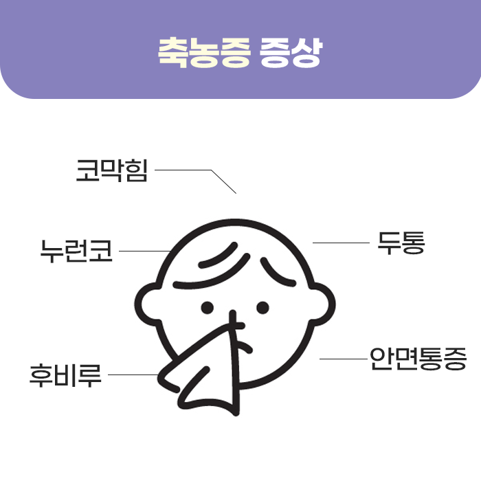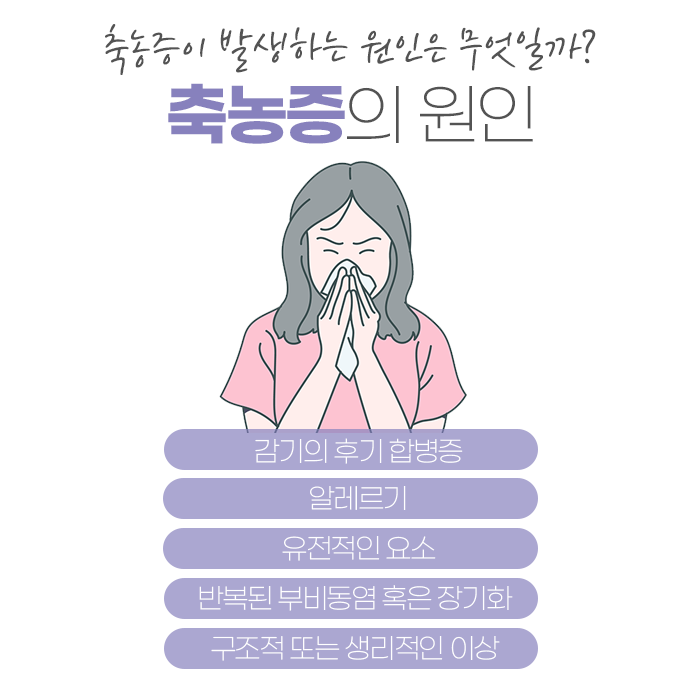 축농증의 원인으로는 감기, 알레르기 비염, 세균 감염 등이 있으며, 부비동의 염증이 발생할 수 있는 다양한 경로가 있습니다. 감기나 알레르기 비염은 코막힘을 유발하고, 이로 인해 부비동에 염증이 생기며 축농증을 초래할 수 있습니다. 바이러스 감염이 발생한 후 1주일 이상 증상이 지속되면, 2차 세균 감염이 발생해 축농증을 유발할 수 있습니다. 또한 꽃가루, 먼지, 곰팡이 등 알레르기 물질에 노출되면 염증이 생기고, 부비동염을 유발할 수 있습니다. 비강의 구조적 문제(예: 비중격 만곡, 코폴립 등)로 인해 부비동이 막히거나 통기성이 나빠지면, 염증 발생이 쉬워질 수 있습니다. 그 외에도 찬 공기, 건조한 공기, 오염된 공기 등이 환경적 요인으로 축농증을 유발할 수 있습니다.