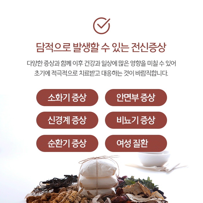 위장환경을 개선하여 원활한 소화를 돕고 건강한 혈액을 생성해 면역력 향상과 전반적인 건강증진을 돕습니다. 한약은 제조하고 담적으로 발생하는 위장장애와 증상에 따라 복용횟수와 기간이 달라질 수 있습니다. 침은 혈자리를 자극해 위장자극을 줄이며 원활한 소화를 돕습니다.