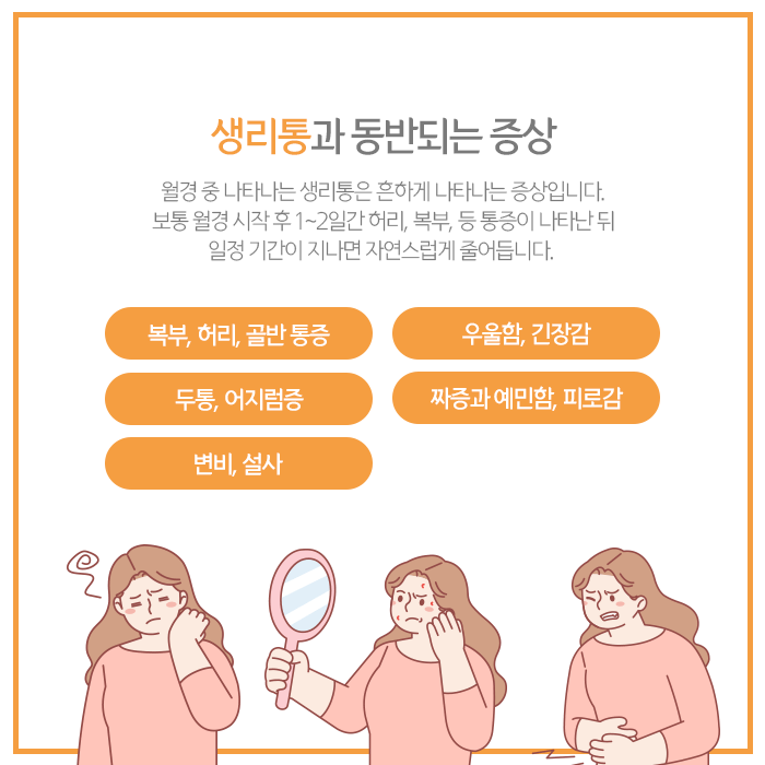 그러나 생리통이 반복되며 피로감, 두통, 복부팽만감, 가슴통증, 여드름, 변비, 설사, 불안, 우울, 집중력장애, 식욕변화, 불안감 등의 증상이 반복된다면 검사를 통해 원인을 파악해보는 것이 필요합니다.