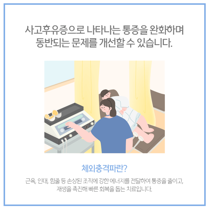 체외충격파는 사고 충격으로 손상된 부위에 고에너지 음파를 적용하는 방법입니다. 주변 혈관 재형성을 돕고, 힘줄과 주변 조직을 활성화하여 통증을 완화하는 비침습적 치료방법입니다. 여러 통증이 나타나는 부위에 적용할 수 있으며, 치료 시간은 20분 내외입니다.