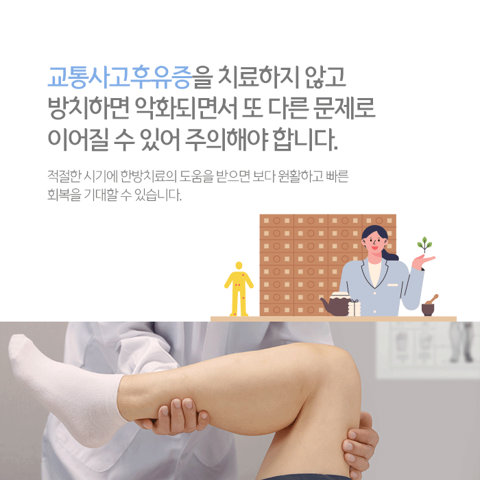 외에도 다양한 한방치료는 사고 후유증과 건강상태 등에 따라 다르게 적용되므로 담당 의료진과 상담을 통해 확인할 수 있습니다. 사고 후유증을 치료하지 않고 방치하면 만성적인 통증뿐 아니라 또 다른 질환으로 이어질 수 있고 이후 건강과 일상에 많은 영향을 미칠 수 있어 초기에 적극적으로 대응하는 것이 바람직합니다.