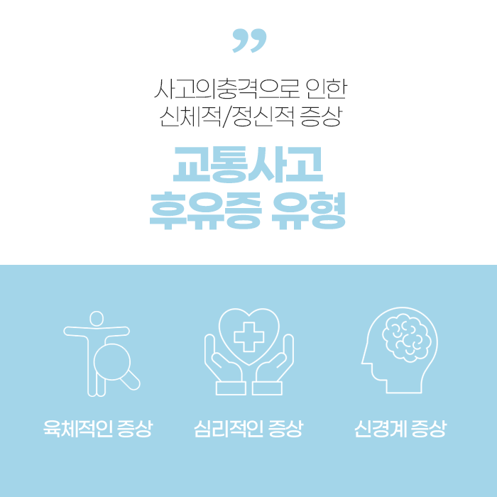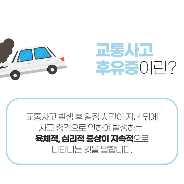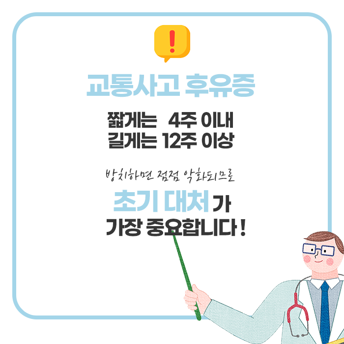 교통사고는 예고 없이 갑작스럽게 발생하기 때문에 사고 당시 충격이 크지 않다고 해도 방심할 수 없습니다. 외상이 없어 보여도 우리 몸은 사고 순간 긴장 상태에 들어가고, 뇌에서는 스트레스 호르몬이 급격히 분비되어 통증을 일시적으로 느끼지 못하게 됩니다. 하지만 시간이 지나면서 점차 통증이 드러나거나 특정 부위의 불편감이 나타나는 경우가 적지 않기 때문에 사고 후에는 세심한 관찰과 관리가 필요합니다.
