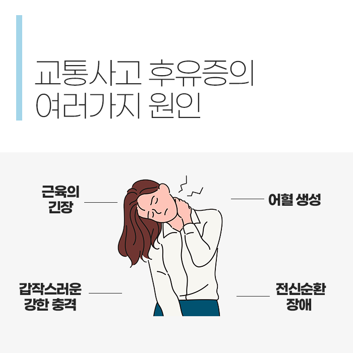 사고 당시에는 긴장 상태에서 몸을 제대로 움직이지 못하고, 근육이 경직된 채로 충격을 흡수하게 됩니다. 이 과정에서 근육과 인대에 미세한 파열이 생기고, 혈액순환의 흐름이 일시적으로 저하되어 염증이 생길 수 있습니다. 특히 척추 주변 조직의 긴장과 이상은 시간이 지남에 따라 만성적인 통증으로 변질되기 쉽기 때문에 빠른 회복을 위해 바른 진단이 필요합니다.