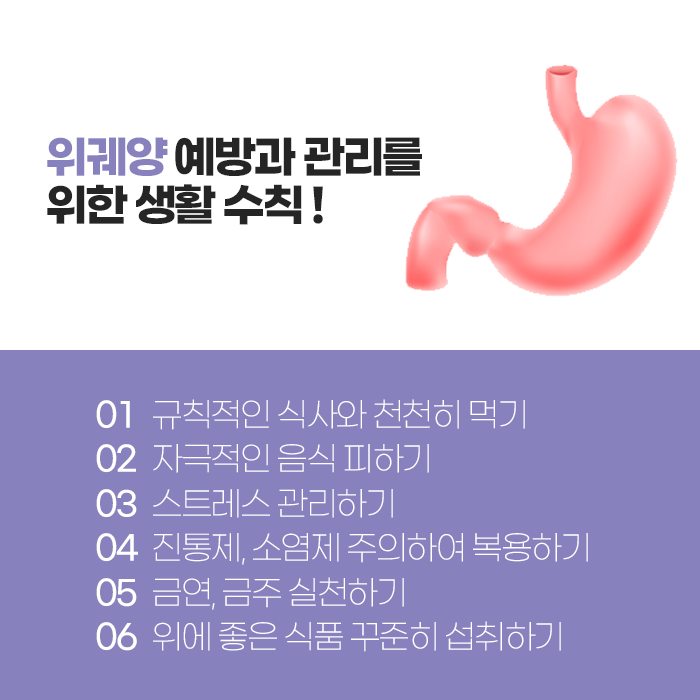 약물 복용 시에는 진통제나 소염제를 장기간 사용해야 하는 경우 반드시 위 보호제를 함께 복용하거나 의사와 상담하여 위장에 부담이 적은 약제로 변경하는 것이 필요합니다. 흡연과 음주도 줄이거나 중단하는 것이 위 점막 건강을 유지하는 데 중요합니다. 이런 생활습관의 개선이 위궤양 재발을 막는 데 중요한 역할을 합니다.