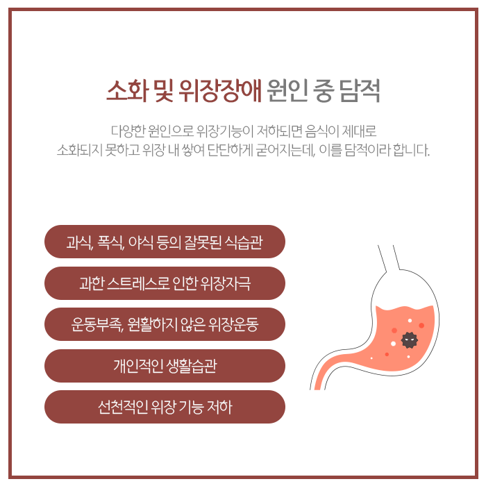 담적은 위장을 포함한 소화기의 기능이 저하되어 내부 대사의 부산물들이 제때 순환되지 못하면서 체내에 쌓여 기능을 저하시키고 딱딱한 덩어리 형태의 노폐물이 굳은 상태를 말합니다.