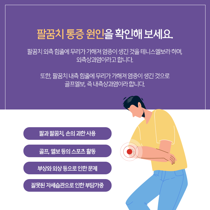 건강을 위해 운동을 하는 것은 좋지만, 과도한 시간을 하거나 무리하면 오히려 건강에 문제가 생길 수 있습니다. 그리고 팔 사용이 많은 운동이나 일을 한다면 팔꿈치 통증이 생길 수 있습니다.