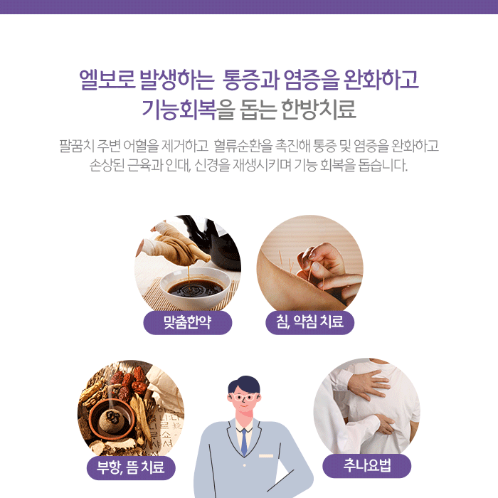 한약성분에서 추출해 정제한 약물을 소량 주입하는 약침치료는 팔꿈치 주변 염증과 통증을 완화하는데 도움이 됩니다. 주입되는 약물에 따라 여러 방법이 있고 사용되는 성분에 대한 알레르기 반응을 확인한 후에 진행합니다. 체질에 맞는 약재를 구성해 조제하는 한약은 체내 어혈을 제거하고 기혈순환을 촉진해 팔꿈치 주변 염증과 통증을 완화합니다.