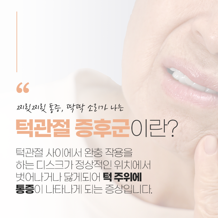 입을 크게 벌리거나 음식을 씹을 때 턱 부위에서 통증이 발생하거나 ‘딱딱’하는 소리가 나는 경우, 이는 많은 사람들이 경험하는 흔한 증상입니다. 특히 피곤하거나 스트레스를 받을 때 이런 증상이 나타나기 쉽습니다. 이러한 증상은 주로 턱관절 장애(혹은 턱관절 증후군)와 관련이 있습니다. 턱관절은 입을 열고 닫는 역할을 하며, 음식을 씹는 데 중요한 기능을 수행합니다. 하지만 여러 원인으로 턱관절에 문제가 생기면 불편감과 통증을 유발할 수 있습니다. 턱관절 증후군은 디스크가 제자리에서 벗어나거나 손상되면서, 턱 주위에 지속적인 통증을 일으키는 질환입니다. 턱관절 증후군은 초기에는 미세한 불편함이나 통증으로 시작할 수 있지만, 시간이 지나면서 증상이 악화될 가능성이 큽니다.