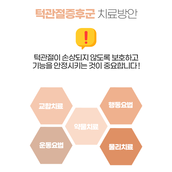 열 치료, 마사지, 전기 치료 등을 통해 근육의 긴장을 풀어주며, 염증이 있을 경우 염증을 억제하고 통증을 완화할 수 있는 약물을 사용하기도 합니다. 또한 턱 운동을 통해 턱관절의 움직임을 정상화시키고, 잘못된 습관을 교정하는 것이 치료의 핵심입니다.