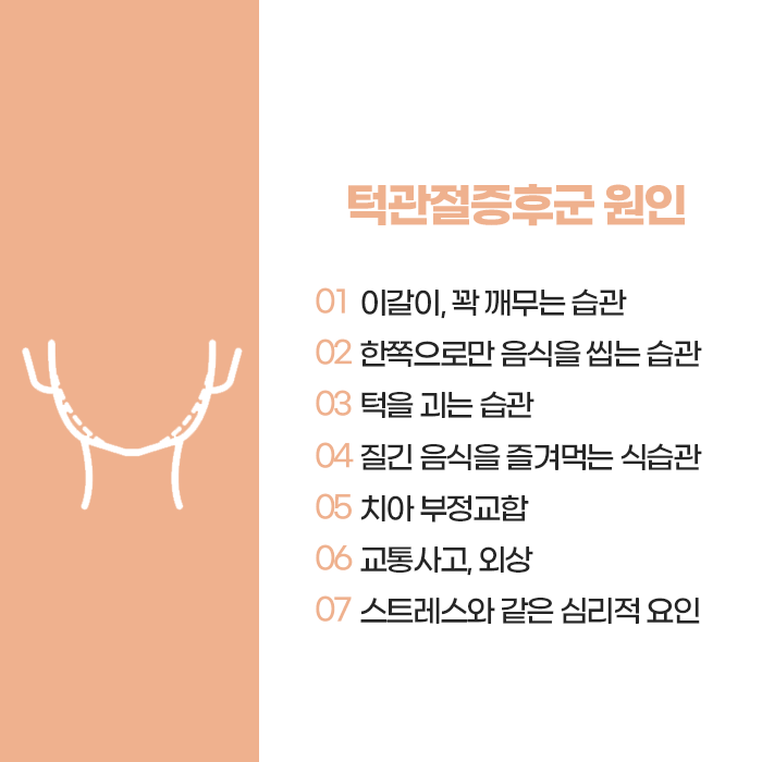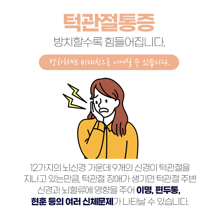 이러한 후천적인 원인으로 인해 발생한 턱관절 문제는 치료와 더불어 생활 습관의 교정이 매우 중요합니다. 이를 개선하지 않으면 증상이 장기화되거나 만성화될 수 있습니다. 턱관절 증후군을 방치하면 통증이 심화되고, 턱관절 주변 조직에 손상이 가해져 결국 구조적 문제로 발전할 수 있습니다. 턱관절을 지나는 여러 신경이 압박을 받게 되면, 이로 인해 이명, 편두통, 현기증, 집중력 저하와 같은 신경계 증상도 동반될 수 있습니다. 특히 턱관절을 지나가는 뇌신경 중 대부분이 이 부위와 밀접하게 연결되어 있어, 턱관절에 문제가 생기면 전반적인 신체에 영향을 미칠 수 있습니다. 그렇기 때문에 턱관절에 이상이 의심될 경우, 조기에 진단하고 치료를 받는 것이 필수적입니다.