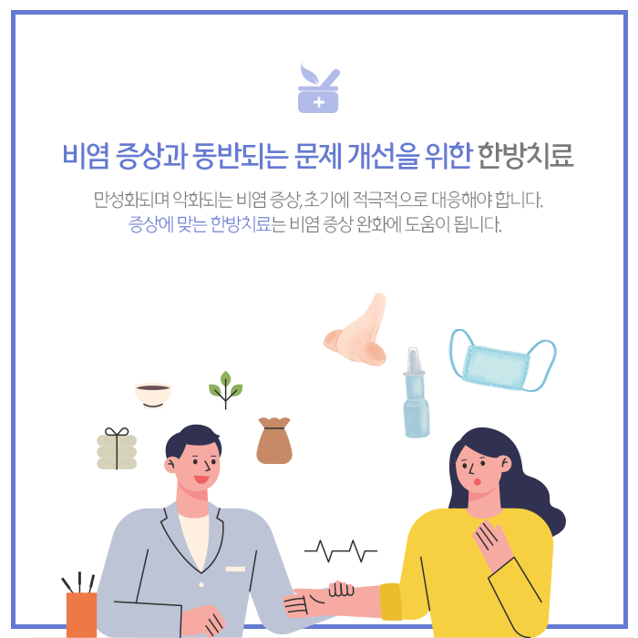 알레르기 비염 일정 부분 환자는 천식을 동반하며, 유아기에는 아토피 피부염과 함께 나타나기도 합니다. 이후 일상과 건강에 많은 영향을 미칠 수 있어 적절한 시기에 한방치료의 도움받는 것이 좋습니다.