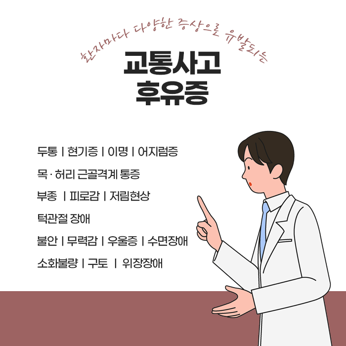 예기치 않게 벌어지는 교통사고는 짧은 순간에 우리 몸의 균형과 일상을 무너뜨릴 수 있는 충격적인 사건입니다. 외부 상처가 보이지 않더라도 충돌의 충격이 내부 깊숙한 구조에까지 영향을 주기 때문에 처음에는 아무렇지 않다고 느낄 수 있지만, 시간이 지나면서 점점 불편한 증상들이 드러나는 경우가 많습니다.