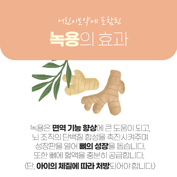 녹용을 비롯한 일부 약재는 혈액순환을 촉진하고 체온을 안정시켜 활력을 높여줍니다. 이로 인해 쉽게 피로를 느끼던 아이가 점차 활기를 찾고, 수면 질이나 식욕이 개선되는 경우도 많습니다. 성장기에는 뼈와 근육이 빠르게 발달해야 하는데, 이 과정에서 충분한 영양과 에너지가 뒷받침되지 않으면 성장 속도가 더뎌지기 쉽습니다. 성장판이 활발하게 작용하는 시기에 체력이 뒷받침되지 않으면 또래보다 키가 늦게 크거나 체중이 늘지 않는 경우가 나타나기도 합니다.