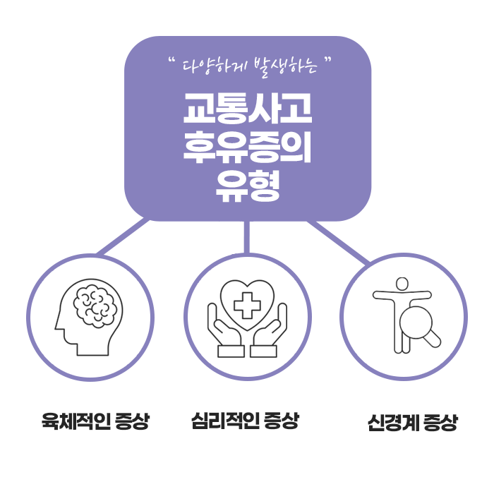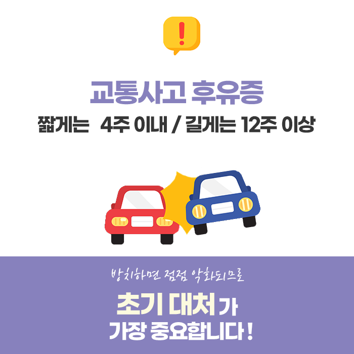 교통사고 후유증은 사고 직후 증상이 뚜렷하지 않다고 해서 안심할 수 없습니다. 시간이 지날수록 통증이나 불편함이 커질 수 있으며, 몸 전체에 영향을 미치는 문제로 발전할 가능성도 있습니다. 그렇기 때문에 증상이 경미하더라도 가능한 빠르게 진단을 받고 체계적인 치료를 시작하는 것이 중요합니다.