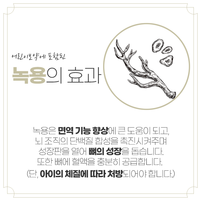 성장보약의 대표적인 구성 성분 중 하나인 녹용은 성장판 자극을 돕는 것으로 잘 알려져 있습니다. 그러나 녹용의 효능은 단순히 뼈 성장에 국한되지 않습니다. 체력 보강, 혈액순환 촉진, 피로 해소, 면역력 강화 등 다방면으로 작용하여 아이가 성장할 수 있는 토대를 만들어줍니다. 다만 녹용은 아이의 체질과 상태에 따라 적정 용량과 배합이 달라져야 하므로, 전문가의 정확한 진단 아래에 처방받는 것이 중요합니다.