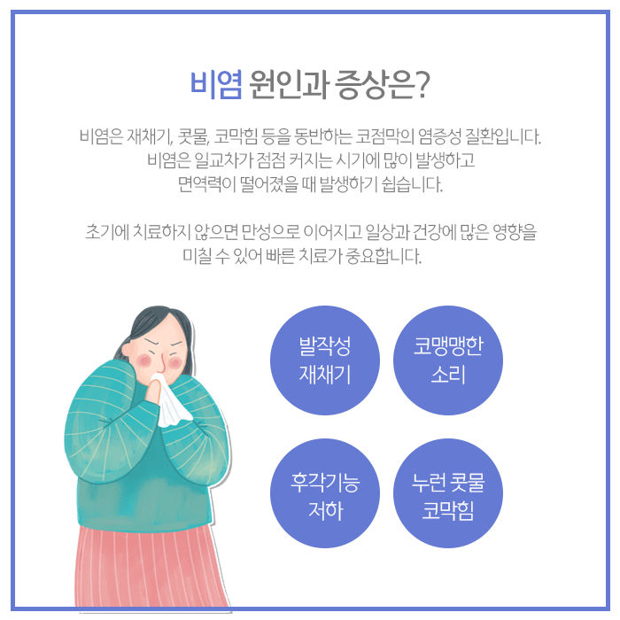 비염을 치료하지 않고 방치하면 재채기나 콧물뿐 아니라 집중력을 떨어뜨리고, 수면을 방해하며, 만성적인 피로와 두통까지 이어질 수 있습니다. 특히 환절기마다 증상이 반복된다면 체계적인 개선과 한방치료가 필요한 상환입니다.