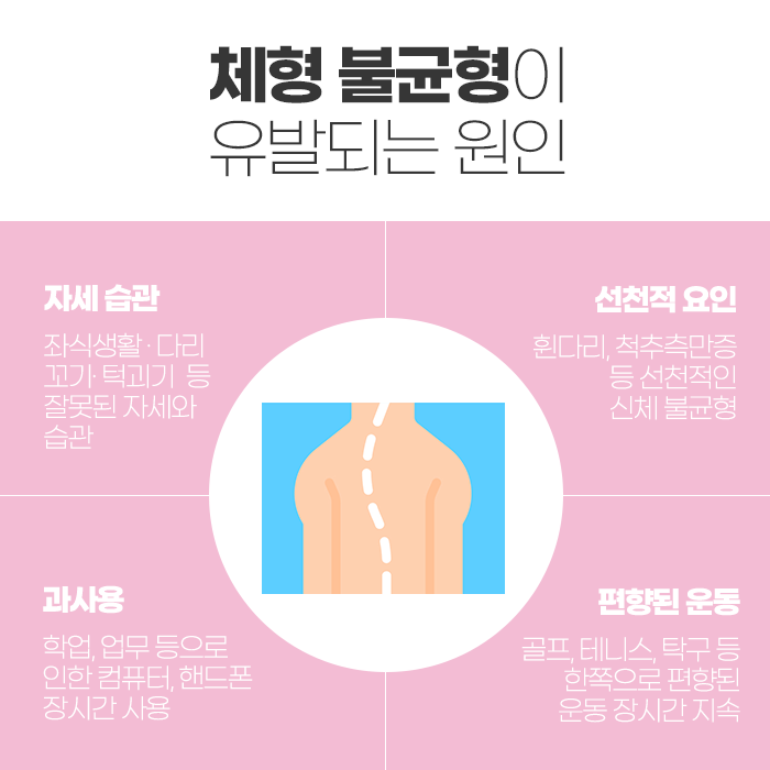 체형이 비틀리면 몸의 하중이 한쪽으로 쏠리게 되어, 목과 어깨, 허리, 골반 등 특정 부위에 과도한 부담이 가해집니다. 그 결과 거북목, 일자목, 골반 틀어짐, 어깨 높이 비대칭, 허리 통증과 같은 문제가 나타날 수 있습니다.