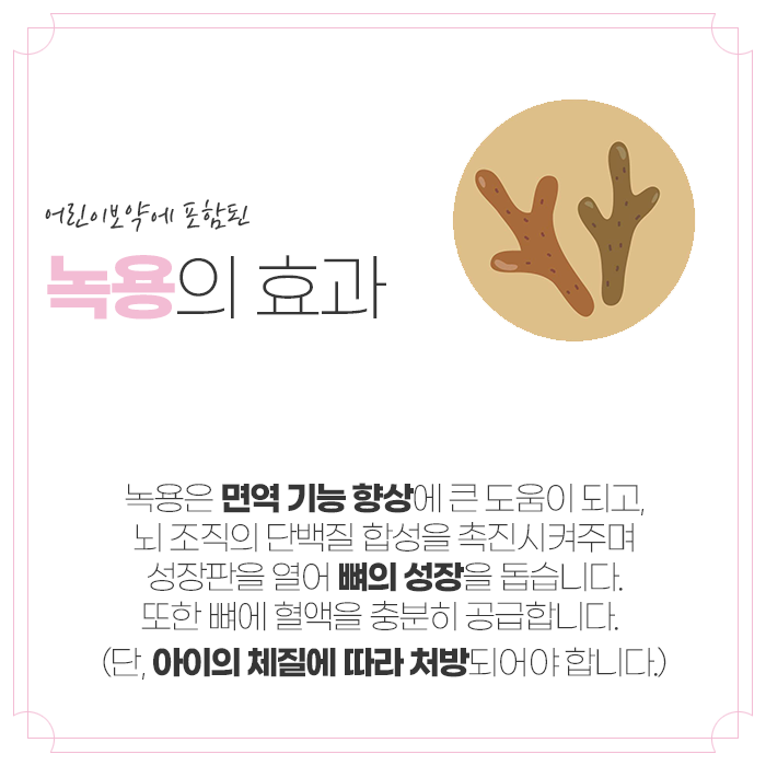 성장 보조 한약의 주요 약재로 잘 알려진 녹용은 성장판 활성화에 도움이 되는 대표적인 성분입니다. 하지만 녹용의 역할은 단지 뼈의 길이를 늘리는 것에만 국한되지 않습니다. 혈액순환 개선, 체력 회복, 면역 증진, 피로 해소 등 다방면에서 작용하여 성장의 기초 체력을 다져줍니다. 단, 녹용은 체질에 따라 흡수율과 반응이 다르므로, 반드시 전문가의 진단을 통해 적절한 용량과 조합으로 복용하는 것이 안전합니다.