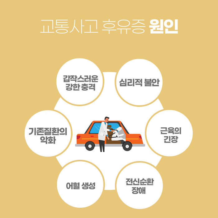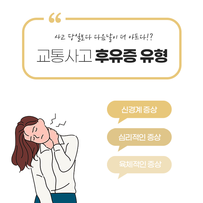 시간이 지나면 목과 허리가 굳거나 몸이 뻐근하고 저릿한 증상이 뒤늦게 나타나는 경우가 많습니다. 특히 충격으로 머리가 앞뒤로 크게 흔들리는 편타성 손상은 목 주변 조직을 약화시키고 두통이나 어깨결림, 팔 저림 같은 다양한 후유증을 유발할 수 있습니다.
