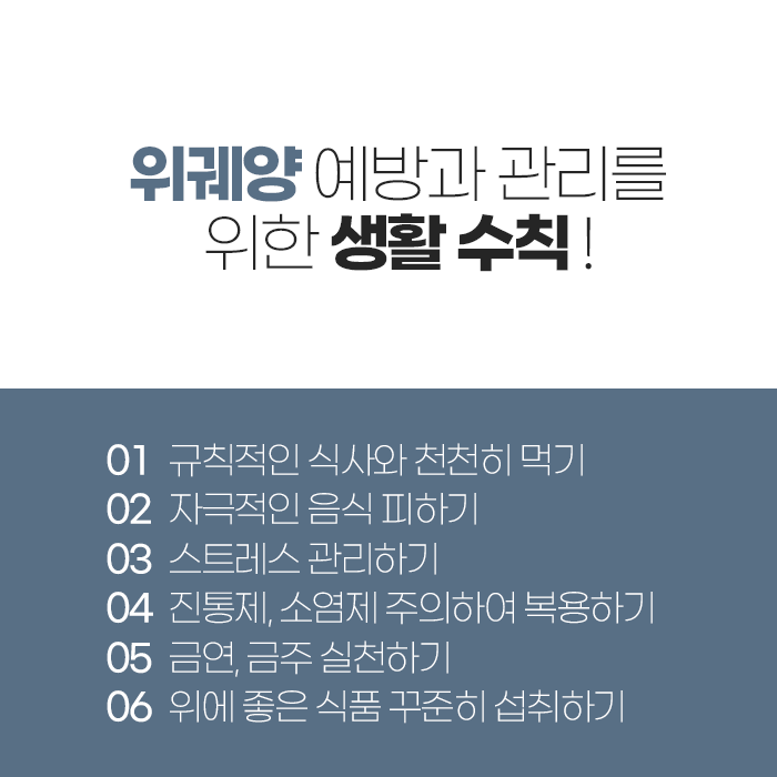 치료는 원인에 따라 다각도로 접근합니다. 헬리코박터균이 발견되면 항생제와 위산 억제제를 병용하여 균을 제거하고 궤양 치유를 돕습니다. NSAIDs 복용이 원인이라면 약물 조정 또는 대체제를 고려하고, 점막 보호제나 위벽 보호제를 함께 사용합니다. 그러나 약물만으로는 완전한 해결이 어렵기 때문에 생활습관 개선이 필수적입니다. 기름진 음식, 매운 음식, 커피, 술, 탄산음료 등은 가능한 피하고, 한 끼 과식보다는 소량씩 자주 먹는 것이 위 부담을 줄이는 데 유리합니다. 식후 바로 눕는 습관은 피하고, 저녁 식사는 취침 2시간 전까지 마치는 것이 바람직합니다.