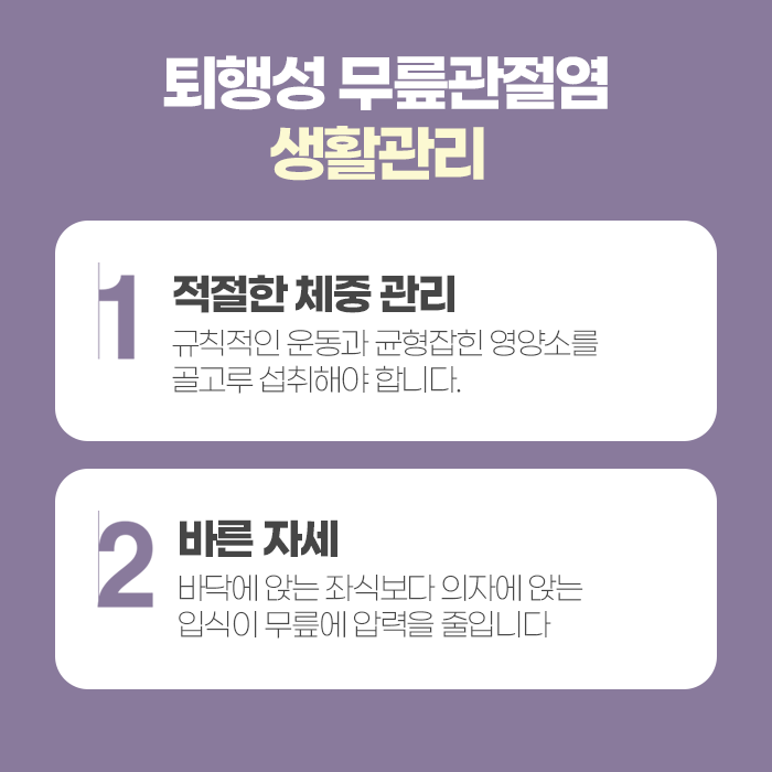무릎 관리를 위해 가장 기본이 되는 것은 생활습관입니다. 체중을 관리해 관절에 가해지는 압력을 줄이고, 바닥에 오래 앉기보다는 의자 생활을 중심으로 하여 무릎 굴곡을 최소화하는 것이 좋습니다. 가벼운 스트레칭과 근력 운동을 꾸준히 시행하면 무릎 주변 근육과 인대가 강화되어 충격을 흡수하는 능력이 좋아지고, 관절 안정성도 향상됩니다.