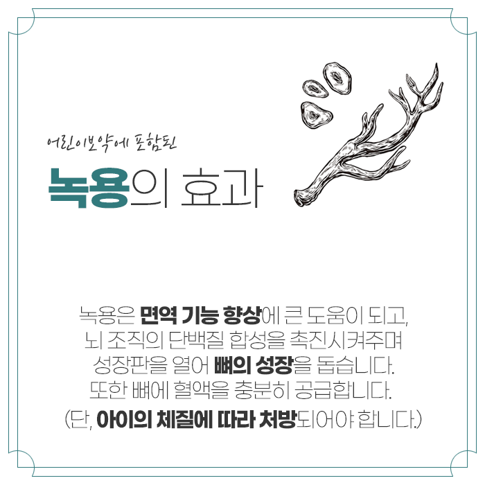 녹용은 성장 처방에서 자주 활용되지만, 성장판을 직접 자극하는 것 이상의 의미가 있습니다. 혈액순환을 촉진하고 전신 기력을 보충하며 면역체계를 강화해 성장할 수 있는 기반을 탄탄하게 다지는 역할을 합니다. 또한 성장에는 정서 상태가 매우 큰 비중을 차지합니다. 걱정이 많거나 감정 기복이 큰 아이는 성장 호르몬 분비가 불규칙해지고 숙면이 어려워져 성장 속도가 쉽게 느려질 수 있습니다.