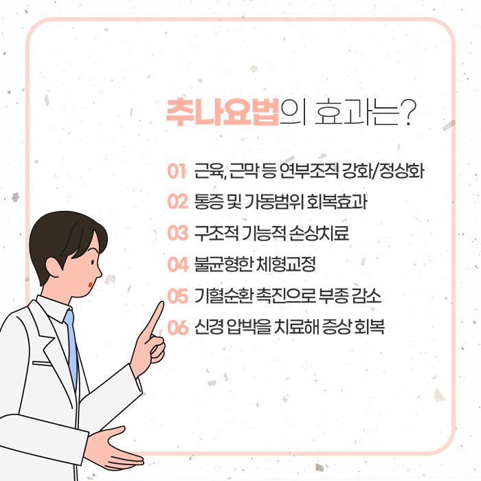 특히 장시간 앉아 근무하는 직장인·스마트폰 사용이 많아 목과 어깨가 불편한 학생·출산 후 골반 틀어짐이 생긴 여성 등에게 추나치료는 매우 도움이 됩니다. 약물이나 수술 없이 신체 본연의 균형을 회복시키는 자연친화적 치료라는 점도 큰 장점입니다.