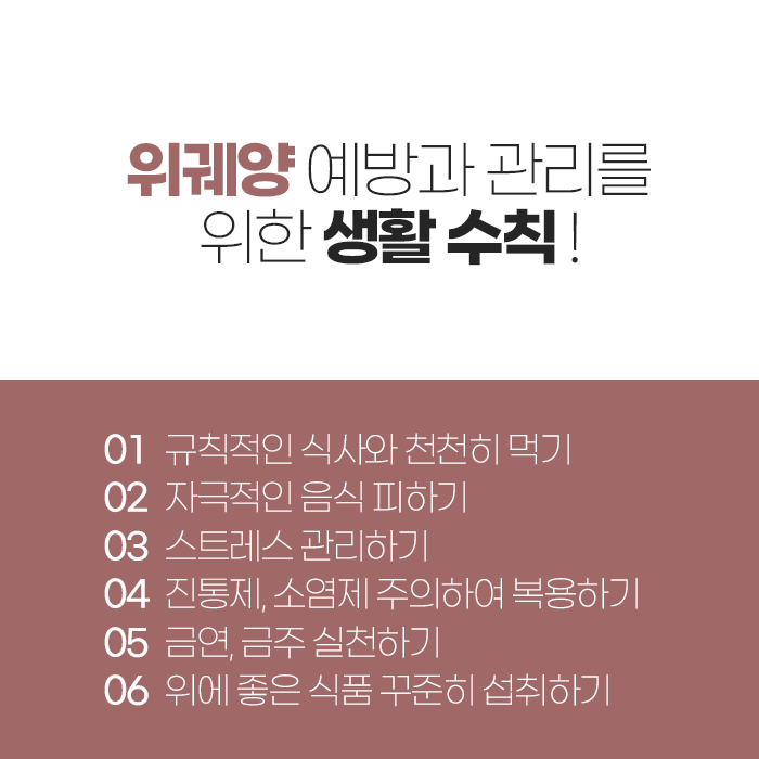 하지만 약물치료만으로는 근본적인 회복이 어렵기 때문에 생활습관 개선이 반드시 필요합니다. 기름지거나 매운 음식, 커피, 탄산음료, 술은 가능한 한 줄여야 하며, 소량씩 여러 번 나누어 먹는 방식이 위 부담을 크게 덜어줍니다. 식사 직후 눕는 습관은 궤양 악화를 유발할 수 있으므로 피해야 하고, 저녁 식사는 잠자기 최소 두 시간 전에 마치는 것이 좋습니다. 스트레스 관리도 매우 중요한 요소입니다. 정서적 긴장이 높아지면 위산이 과다하게 분비되고 점막 회복이 늦어지기 때문입니다. 규칙적인 수면, 가벼운 운동, 심호흡 등은 위 기능 안정에 도움이 됩니다. 흡연은 점막 혈류를 감소시켜 재생을 방해하므로 반드시 중단해야 하며, 음주 역시 위산 분비를 자극하므로 가능한 한 피하는 것이 좋습니다.