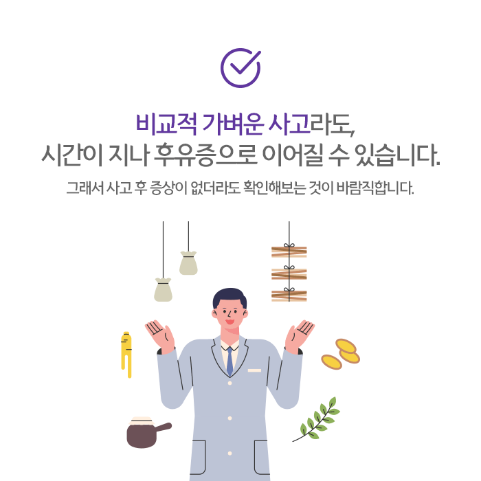교통사고 후유증을 치료하지 않고 방치하면 만성적인 통증과 함께 이후 건강과 일상에 많은 영향을 미치므로 주의해야 합니다. 빠른 대응 및 한방치료와 함께 개인적인 건강관리가 병행된다면 보다 원활한 회복을 기대할 수 있습니다.
