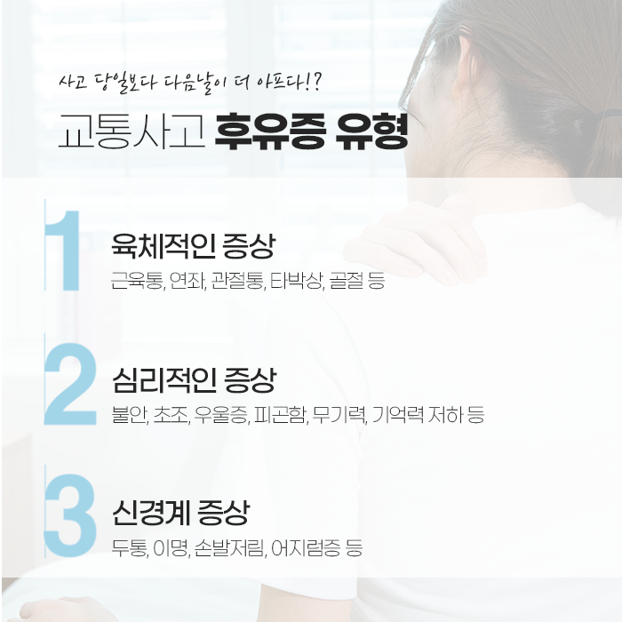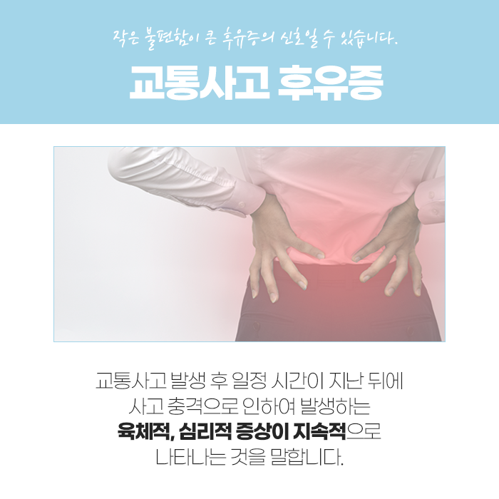 교통사고 후 증상은 사고 당일보다 며칠이 지나 더 또렷해지는 경우가 많습니다. 처음에는 “이 정도면 괜찮다”고 여겼던 불편이 점차 심해져 고개를 돌리기 어렵거나 허리에 힘이 빠지고, 가벼운 활동에도 쉽게 지치는 상황이 생기기도 합니다.