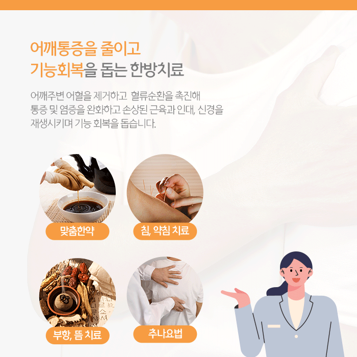 어깨통증 완화와 기능회복을 위해 추나요법, 한약, 침과 약침, 부항, 뜸 등의 한방치료가 활용됩니다. 추나요법은 의료진이 손과 신체, 소도구 등을 활용해 환자분 틀어진 신체를 밀고당기는 자극으로 신체정렬을 바르게 하고 어깨주변 어혈을 제거해 기혈순환을 촉진하는 한방치료입니다.