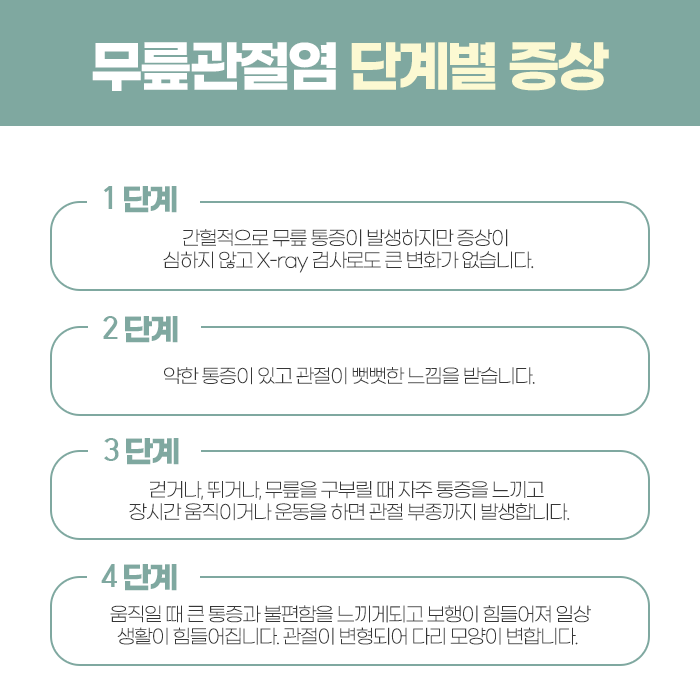 초기에는 가볍게 뻐근하거나 뻣뻣한 느낌으로 시작하지만, 관리 없이 지내다 보면 붓기와 통증이 반복되고 다리 정렬 변화나 근력 저하로 이어질 수 있습니다. 퇴행성 관절염의 특징 중 하나는 활동량이 늘어난 뒤 통증이 심해진다는 점이며, 아침에 일어났을 때나 날씨가 차가워질 때 무릎이 굳는 느낌이 더 강해지기도 합니다. 오래 앉아 있다가 일어날 때 불편함을 느끼는 경우도 흔합니다.