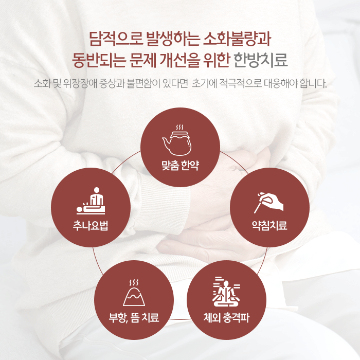 명치통증이나 잦은 체기, 복부 팽만이 오래 지속되는 경우 위장의 운동성이 저하된 상태일 수 있습니다. 위장이 제 역할을 하지 못하면 음식물이 제때 소장으로 내려가지 못하고 머무르게 되는데, 이 과정에서 병리적 물질인 담이 형성되고 이것이 쌓여 위장의 기능에 문제가 생기는 것입니다.