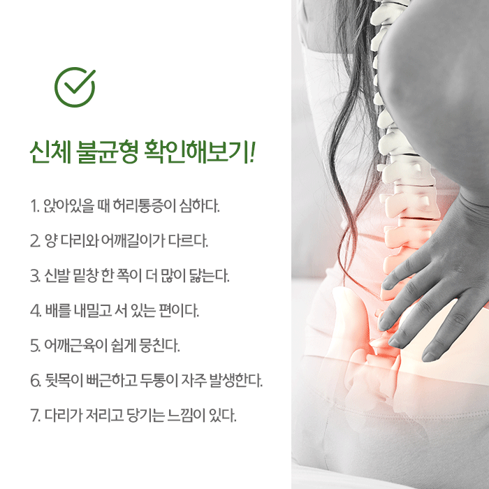 신체통증과 다양한 증상은 한 번 발생하면 쉽게 나아지지 않고 재발하는 경우가 많아 적절한 시기의 한방치료와 함께 개인적인 관리가 필요합니다. 항상 바른자세를 유지할 수 있도록 신경써야 하고 규칙적인 운동을 통해 근력을 향상시키는 것이 바른 체형을 만드는데 큰 도움이 됩니다.