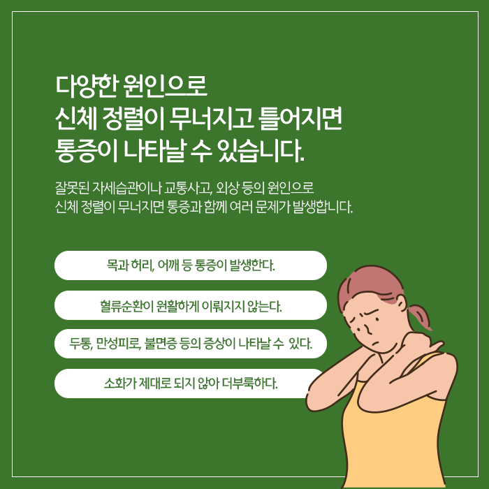 담당 의료진이 손이나 신체, 소도구를 활용해 환자분 신체를 밀고 당기는 자극으로 정렬을 바르게 하여 척추의 부담을 줄이고 통증을 완화하는 한방치료입니다. 혈류순환을 촉진해 디스크 부기를 줄이며 기능 회복을 돕는 추나요법은 디스크 증상과 문제가 되는 정확한 부분에 적당한 자극이 전해져야 하므로 의료진의 정밀한 기술과 해부학적 지식이 요구됩니다.