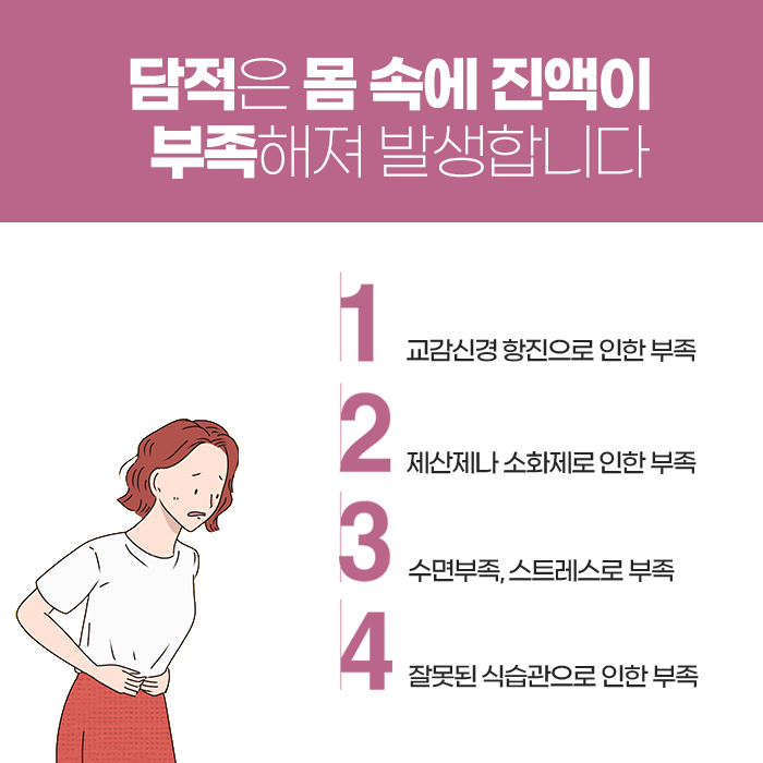 담적은 단순히 체내 노폐물이 쌓인 상태가 아니라, 진액 부족과 기혈 순환 장애로 생긴 깊은 내부 문제입니다. 스트레스가 심하거나 수면이 부족하면 자율신경계의 균형이 무너지면서 위장 운동이 저하되고, 이로 인해 소화 효소와 위산 분비가 원활하지 않아 담적이 생기기 쉽습니다. 또한 자극적인 음식, 과식, 야식 같은 식습관은 담적을 악화시키는 주요 원인입니다.