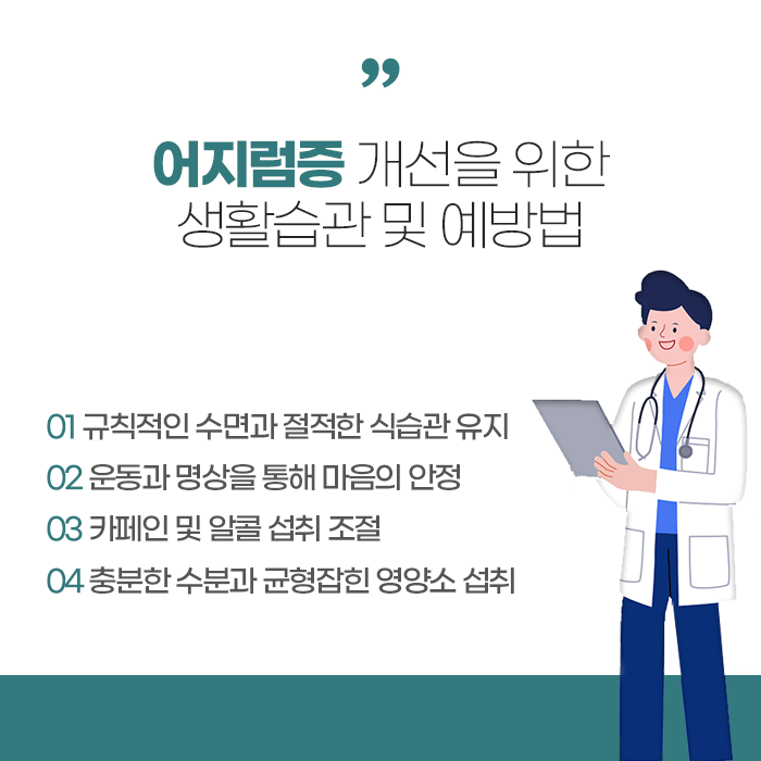 규칙적인 식사와 충분한 수면을 통해 기초 체력을 유지하고 탈수를 예방하기 위해 물을 자주 마시는 것이 좋습니다. 갑작스럽게 자세를 바꾸거나 고개를 급하게 움직이는 행동은 가능하면 피하는 것이 도움이 됩니다. 필요한 경우 안내에 따라 이석 정복 운동을 시행하면 증상 완화에 도움이 될 수 있습니다. 또한 카페인 음료나 음주, 흡연은 자율신경을 자극할 수 있으므로 줄이는 것이 바람직합니다. 대신 가벼운 스트레칭이나 호흡 훈련, 명상과 같은 활동은 긴장을 완화하고 혈액 흐름을 돕는 데 긍정적인 영향을 줄 수 있습니다. 몸이 보내는 작은 변화에 관심을 가지고 원인을 차분히 살피는 태도가 안정적인 생활을 유지하는 데 도움이 됩니다.