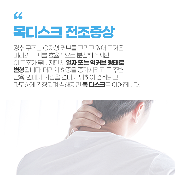 목 디스크는 경추 뼈 사이에 위치한 디스크가 손상되거나 제자리에서 벗어나면서 주변 신경을 자극해 다양한 불편을 유발하는 상태를 의미합니다. 이 디스크는 외부 충격을 흡수하고 목의 움직임을 부드럽게 이어주는 역할을 하는데, 반복적인 부담이나 잘못된 사용 습관이 누적되면 점차 기능이 약해지게 됩니다. 최근에는 스마트폰과 컴퓨터 사용 시간이 크게 늘어나면서 고개를 숙이거나 앞으로 내미는 자세가 일상화되었고, 이로 인해 목에 가해지는 하중이 증가하면서 목 디스크를 겪는 사례도 점점 많아지는 추세입니다. 특히 머리를 앞으로 내민 상태를 장시간 유지하는 자세는 경추에 상당한 압박을 주게 됩니다.