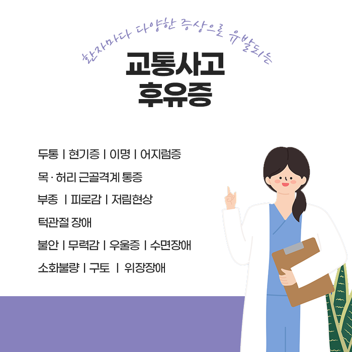 교통사고 후유증은 사고 직후 증상이 뚜렷하지 않다고 해서 안심할 수 없습니다. 시간이 지날수록 통증이나 불편함이 커질 수 있으며, 몸 전체에 영향을 미치는 문제로 발전할 가능성도 있습니다. 그렇기 때문에 증상이 경미하더라도 가능한 빠르게 진단을 받고 체계적인 치료를 시작하는 것이 중요합니다.