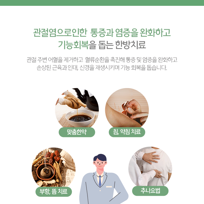 인증된 약재만 사용하여 직접 제조하고 관절염 원인과 증상 등에 따라 복용횟수와 기간이 달라질 수 있습니다. 침으로 혈자리를 자극해 혈류순환을 촉진하며 관절의 부기와 통증을 완화할 수 있습니다. 그리고 순수한 한약성분에서 추출해 정제한 약물을 주입하는 약침치료는 관절주변 어혈을 제거하고 기혈순환을 촉진해 염증과 통증을 줄여줍니다.