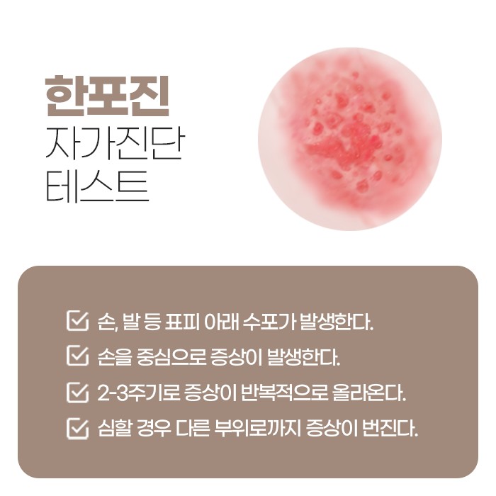 손과 발은 땀이 쉽게 차는 부위이기 때문에 한포진이 자주 발생하는 경향이 있으며, 특히 기온이 높고 습한 시기에 불편이 심해지는 경우가 많습니다. 다만 단순히 땀 분비만으로 설명되지는 않기 때문에 피부 환경 전반을 함께 살펴볼 필요가 있습니다. 주로 청소년기 이후부터 성인 초중반까지 비교적 자주 나타나며, 어린 연령에서는 상대적으로 드문 편입니다. 초기에는 작은 물집이 여러 개 모여 나타나는 경우가 많고, 심한 가려움과 함께 따끔거리거나 화끈거리는 느낌이 동반되기도 합니다. 시간이 지나면서 물집이 커지거나 터지면 진물이 나오고, 이 과정이 반복되면 피부가 두꺼워지거나 각질이 증가하는 변화로 이어질 수 있습니다.